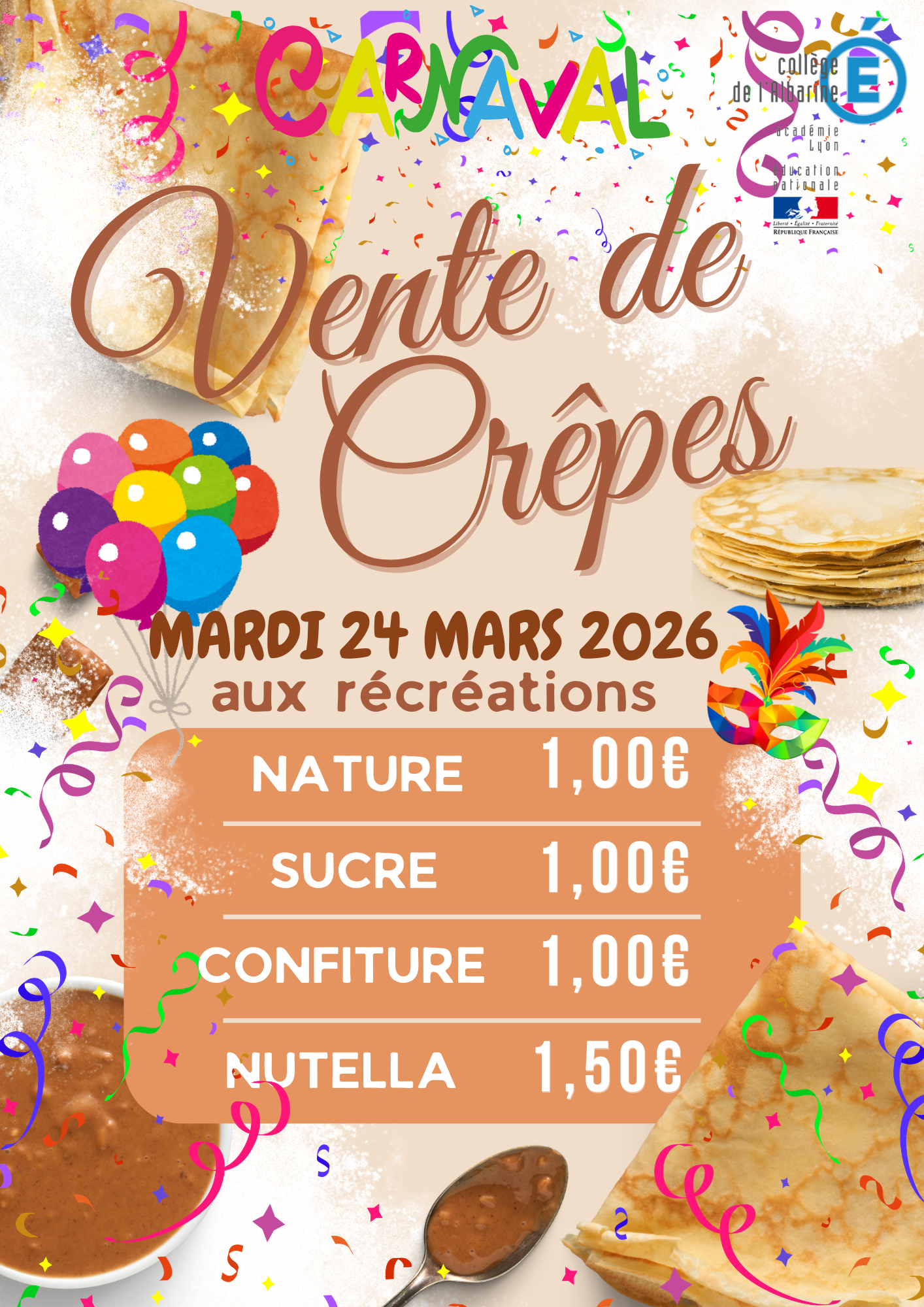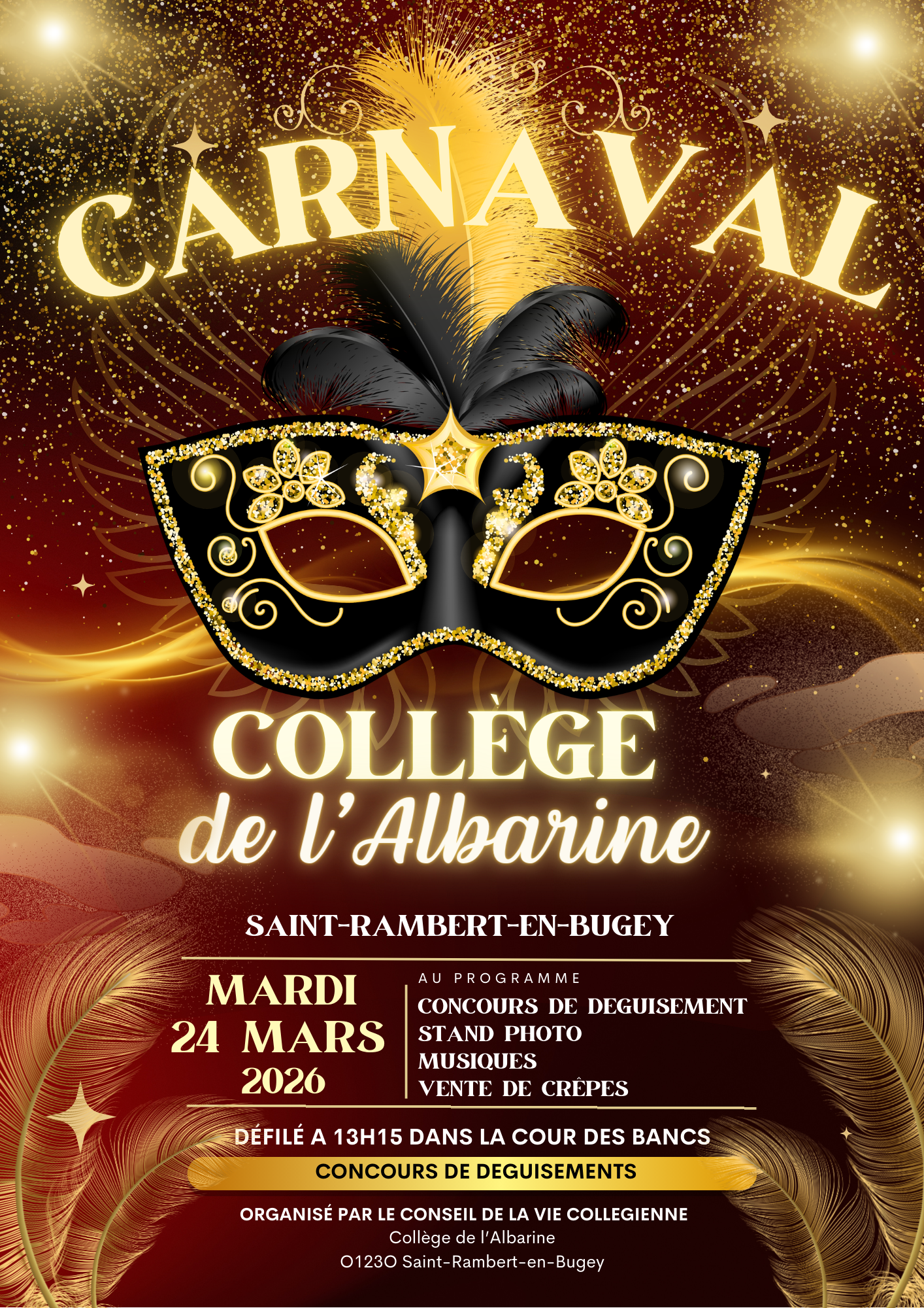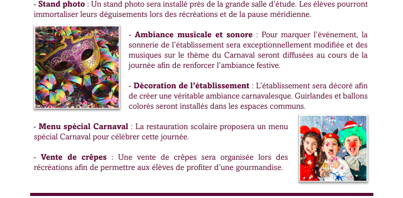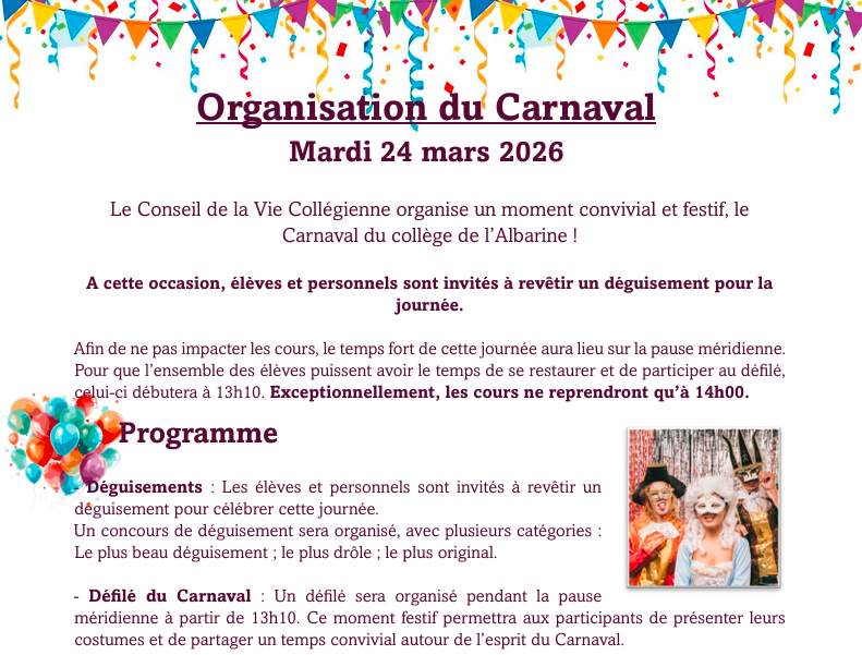 Le Conseil de la Vie Collégienne organise le Carnaval le mardi 24 mars ! Concours de déguisement, défilé, vente de crêpes, stand photo... Voici le programme de cette journée